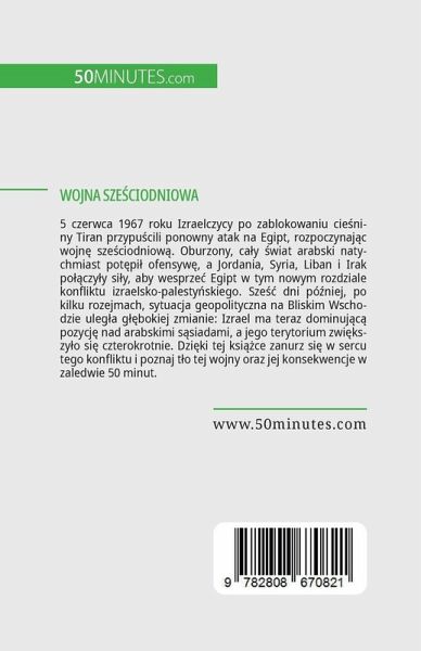 5 czerwca 1967 roku Izraelczycy po zablokowaniu cie¿niny Tiran przypu¿cili ponowny atak na Egipt, rozpoczynaj¿c wojn¿ sze¿ciodniow¿. Oburzony, cäy ¿wiat arabski natychmiast pot¿pi¿ ofensyw¿, a Jordania, Syria, Liban i Irak po¿¿czy¿y si¿y, aby wesprze¿ Egipt w tym nowym rozdziale konfliktu izraelsko-palesty¿skiego. Sze¿¿ dni pó¿niej, po kilku rozejmach, sytuacja geopolityczna na Bliskim Wschodzie uleg¿a g¿¿bokiej zmianie: Izrael ma teraz dominuj¿c¿ pozycj¿ nad arabskimi s¿siadami, a jego terytorium zwi¿kszy¿o si¿ czterokrotnie. Dzi¿ki tej ksi¿¿ce zanurz si¿ w sercu tego konfliktu i poznaj t¿o tej wojny oraz jej konsekwencje w zaledwie 50 minut.