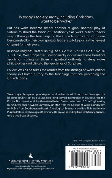 In today's society, many, including Christians, want to be "woke." But has woke become simply another religion, another ploy of Satan's to shred the fabric of Christianity? As woke critical theory seeps through the teachings of the Church, many Christians are being misled by their own spiritual leaders to take part in the newest attempt for their souls. In Woke Religion: Unmasking the False Gospel of Social Justice, Wes Carpenter unashamedly addresses these heretical teachings, calling on those in spiritual authority to deny woke philosophies and cling to the teachings of Scripture. Follow Wes as he takes the reader from the stirrings of woke critical theory in Church history to the teachings that are pervading the Church today.