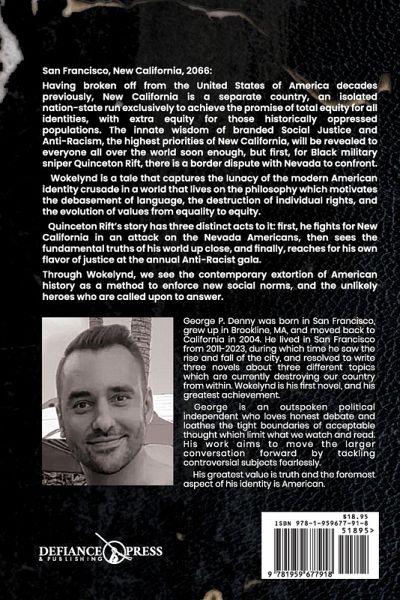 San Francisco, New California, 2066: Having broken off from the United States of America decades previously, New California is a separate country, an isolated nation-state run exclusively to achieve the promise of total equity for all identities, with extra equity for those historically oppressed populations. The innate wisdom of branded Social Justice and Anti-Racism, the highest priorities of New California, will be revealed to everyone all over the world soon enough, but first, for Black military sniper Quinceton Rift, there is a border dispute with Nevada to confront. Wokelynd is a tale that captures the lunacy of the modern American identity crusade in a world that lives on the philosophy which motivates the debasement of language, the destruction of individual rights, and the evolution of values from equality to equity. Quinceton Rift's story has three distinct acts to it: first, he fights for New California in an attack on the Nevada Americans, then sees the fundamental truths of his world up close, and finally, reaches for his own flavor of justice at the annual Anti-Racist gala. Through Wokelynd, we see the contemporary extortion of American history as a method to enforce new social norms, and the unlikely heroes who are called upon to answer.
