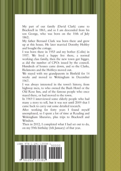 My part of our family (David Clark) came to Bracknell in 1861, and so I am descended from his son George, who was born on the 10th of July 1862. My father Bernard Clark was born there and grew up at this house. He later married Dorothy Hobley and bought the cottage. I was born there in 1953 and my bother (Colin) in 1957. I was always interested in the town's history, from highway men, to who owned the Bush Hotel or the Old Rose Inn, and of the famous people who once stayed there, or had moved to the town. In 1969 I interviewed some elderly people who had many a story to tell, but it was not until 2009 that I came back to carry out some detailed research. After working for forty years I found myself unemployed, so I spent a lot of time at Reading and Wokingham libararies, plus trips to Bracknell and Windsor. Then in 2012, I completed what I had set out to do, on my 59th birthday (6th January) of that year.