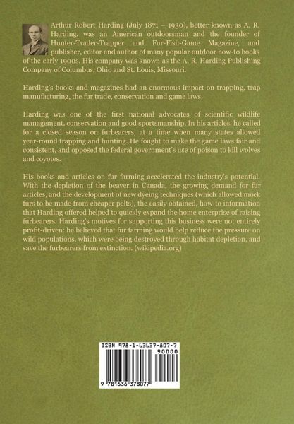 Arthur Robert Harding (July 1871 - 1930), better known as A. R. Harding, was an American outdoorsman and the founder of Hunter-Trader-Trapper and Fur-Fish-Game Magazine, and publisher, editor and author of many popular outdoor how-to books of the early 1900s. His company was known as the A. R. Harding Publishing Company of Columbus, Ohio and St. Louis, Missouri. Harding's books and magazines had an enormous impact on trapping, trap manufacturing, the fur trade, conservation and game laws. Harding was one of the first national advocates of scientific wildlife management, conservation and good sportsmanship. In his articles, he called for a closed season on furbearers, at a time when many states allowed year-round trapping and hunting. He fought to make the game laws fair and consistent, and opposed the federal government's use of poison to kill wolves and coyotes. His books and articles on fur farming accelerated the industry's potential. With the depletion of the beaver in Canada, the growing demand for fur articles, and the development of new dyeing techniques (which allowed mock furs to be made from cheaper pelts), the easily obtained, how-to information that Harding offered helped to quickly expand the home enterprise of raising furbearers. Harding's motives for supporting this business were not entirely profit-driven: he believed that fur farming would help reduce the pressure on wild populations, which were being destroyed through habitat depletion, and save the furbearers from extinction. (wikipedia.org)