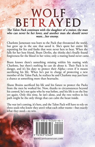 The Talon Pack continues with the daughter of a traitor, the man who can never be her lover, and another man she should never want…her enemy. Charlotte Jamenson was born to the Pack that threatened the world, but grew up in the one that saved it. She's spent her entire life repenting for lies and faults that were never hers to bear. When she falls for her best friend, Bram Devlin, she thinks she's finally found forgiveness for the blood in her veins; only a mating bond never came. Bram knows there's something missing within his mating with Charlotte, but there's nothing he can do about it. Their Pack is in danger, and it's his duty to protect their Alpha-even if it means sacrificing his life. When he's put in charge of protecting a new member of the Talon Pack, he realizes he and Charlotte may just have a chance at something more than heartache. Shane Bruins sacrificed his life and his future to protect the Packs from the men he worked for. Now, thanks to circumstances beyond his control, he's not quite who he was before, and his life is on the line yet again. Only this time, he isn't alone, and the two wolves in his path might be the only things that can calm the beast inside. The war isn't coming, it's here, and the Talon Pack will have to rely on three souls who know they aren't what each other wants-but exactly what they need-to win.