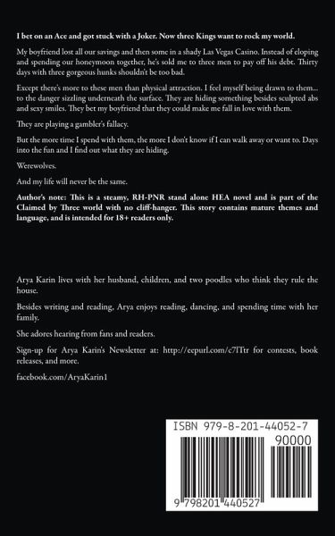 I bet on an Ace and got stuck with a Joker. Now three Kings want to rock my world. My boyfriend lost all our savings and then some in a shady Las Vegas Casino. Instead of eloping and spending our honeymoon together, he's sold me to three men to pay off his debt. Thirty days with three gorgeous hunks shouldn't be too bad. Except there's more to these men than physical attraction. I feel myself being drawn to them... to the danger sizzling underneath the surface. They are hiding something besides sculpted abs and sexy smiles. They bet my boyfriend that they could make me fall in love with them. They are playing a gambler's fallacy. But the more time I spend with them, the more I don't know if I can walk away or want to. Days into the fun and I find out what they are hiding. Werewolves. And my life will never be the same. Author's note: This is a steamy, RH-PNR stand alone HEA novel and is part of the Claimed by Three world with no cliff-hanger. This story contains mature themes and language, and is intended for 18+ readers only.