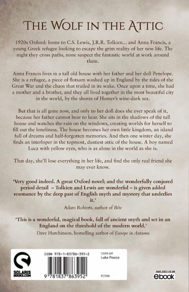 1920s Oxford: home to C.S. Lewis, J.R.R. Tolkien... and Anna Francis, a young Greek refugee looking to escape the grim reality of her new life. The night they cross paths, none suspect the fantastic world at work around them. Anna Francis lives in a tall old house with her father and her doll Penelope. She is a refugee, a piece of flotsam washed up in England by the tides of the Great War and the chaos that trailed in its wake. Once upon a time, she had a mother and a brother, and they all lived together in the most beautiful city in the world, by the shores of Homer's wine-dark sea. But that is all gone now, and only to her doll does she ever speak of it, because her father cannot bear to hear. She sits in the shadows of the tall house and watches the rain on the windows, creating worlds for herself to fill out the loneliness. The house becomes her own little kingdom, an island full of dreams and half-forgotten memories. And then one winter day, she finds an interloper in the topmost, dustiest attic of the house. A boy named Luca with yellow eyes, who is as alone in the world as she is. That day, she'll lose everything in her life, and find the only real friend she may ever know.