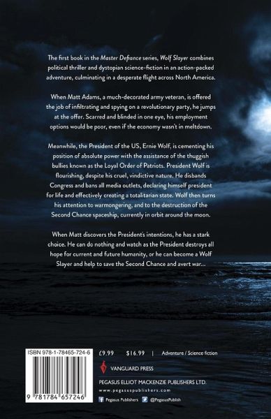 The first book in the Master Defiance series, Wolf Slayer combines political thriller and dystopian science-fiction in an action-packed adventure, culminating in a desperate flight across North America. When Matt Adams, a much-decorated army veteran, is offered the job of infiltrating and spying on a revolutionary party, he jumps at the offer. Scarred and blinded in one eye, his employment options would be poor, even if the economy wasn't in meltdown. Meanwhile, the President of the US, Ernie Wolf, is cementing his position of absolute power with the assistance of the thuggish bullies known as the Loyal Order of Patriots. President Wolf is flourishing, despite his cruel, vindictive nature. He disbands Congress and bans all media outlets, declaring himself president for life and effectively creating a totalitarian state. Wolf then turns his attention to warmongering, and to the destruction of the Second Chance spaceship, currently in orbit around the moon. When Matt discovers the President's intentions, he has a stark choice. He can do nothing and watch as the President destroys all hope for current and future humanity, or he can become a Wolf Slayer and help to save the Second Chance and avert war...
