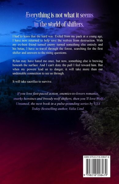 Everything is not what it seems in the world of shifters. I had to learn that the hard way. Exiled from my pack at a young age, I have now returned to help save the wolves from destruction. With my ex-best friend turned enemy turned something else entirely and his betas, I have to travel through the forest, searching for the first shifter and answers to the rising questions. Rylan may have hated me once, but now, something else is brewing beneath the surface. And I can't deny the pull I feel toward him. But when my powers lead us to danger, it will take more than our undeniable connection to see us through. It will take sacrifice to survive. If you love fast-paced action, enemies-to-lovers romance, snarky heroines and broody wolf shifters, then you'll love Wolf Untamed, the next book in a pulse-pounding series by USA Today Bestselling author, Valia Lind. **This series is not RH