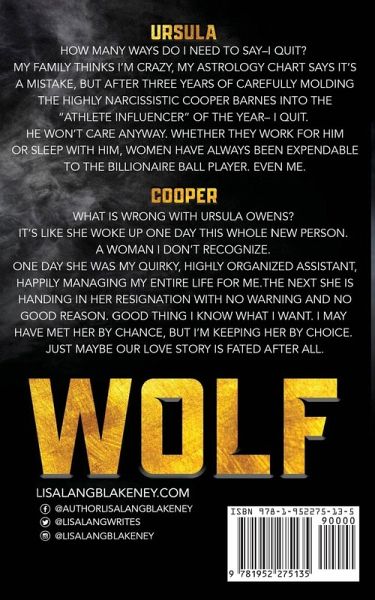 A one-click,damn I read it one night, sexy boss romance and fated love story with the perfect alpha as*hole. From bestselling author Lisa Lang Blakeney, comes a new standalone, billionaire boss romance set in the world of professional football. Ursula How many ways do I need to say–I quit? My family thinks I’m crazy, my astrology chart says it’s a mistake, but after three years of carefully molding the highly narcissistic Cooper Barnes into the "athlete influencer" of the year– I quit. He won’t care anyway. Whether they work for him or sleep with him, women have always been expendable to the billionaire baller. Even me. Cooper What is wrong with Ursula Owens? It’s like she woke up one day this whole new person. A woman I don’t recognize. One day she was my quirky, highly organized assistant, happily managing my entire life for me.The next she is handing in her resignation with no warning and no good reason. Good thing I know what I want. I may have met her by chance, but I’m keeping her by choice. Just maybe our love story is fated after all. Wolf can be read as a standalone romance. It is Book Two in The Nighthawk Series.