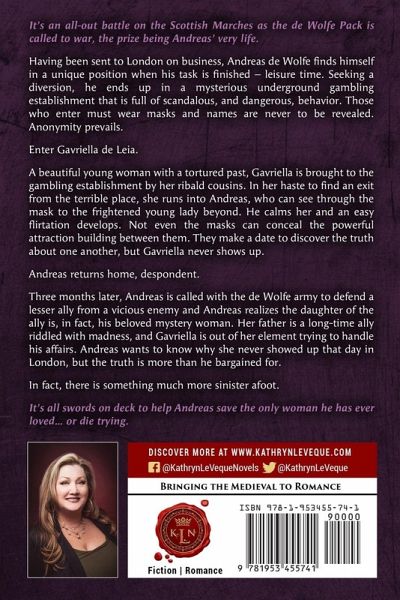 Andreas de Wolfe is the second-eldest de Wolfe grandchild. Son of Troy, he has inherited his father's comely looks, his aggression, and his talent with a sword. The man is born for battle. But he is picky when it comes to women, the reason he's not yet married. Unfortunately, when he does fall for a woman, Andreas sets himself up for a hell of a situation... and it could cost him everything. It's an all-out battle on the Scottish Marches as the de Wolfe Pack is called to war, the prize being Andreas' very life. Having been sent to London on business, Andreas de Wolfe finds himself in a unique position when his task is finished - leisure time. Seeking a diversion, he ends up in a mysterious underground gambling establishment that is full of scandalous, and dangerous, behavior. Those who enter must wear masks and names are never to be revealed. Anonymity prevails. Enter Gavriella de Leia. A beautiful young woman with a tortured past, Gavriella is brought to the gambling establishment by her ribald cousins. In her haste to find an exit from the terrible place, she runs into Andreas, who can see through the mask to the frightened young lady beyond. He calms her and an easy flirtation develops. Not even the masks can conceal the powerful attraction building between them. They make a date to discover the truth about one another, but Gavriella never shows up. Andreas returns home, despondent. Three months later, Andreas is called with the de Wolfe army to defend a lesser ally from a vicious enemy and Andreas realizes the daughter of the ally is, in fact, his beloved mystery woman. Her father is a long-time ally riddled with madness, and Gavriella is out of her element trying to handle his affairs. Andreas wants to know why she never showed up that day in London, but the truth is more than he bargained for. In fact, there is something much more sinister afoot. The truth behind Gavriella is far darker than Andreas could have imagined and he soon finds himself swept up in the horror she is linked to. In the lowlands of Scotland a devil lives, one that wants Gavriella for his very own and will stop and nothing to get her. It's all swords on deck to help Andreas save the only woman he has ever loved... or die trying.