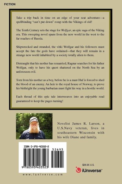 Take a trip back in time on an edge of your seat adventure-a spellbinding "can't put down" romp with the Vikings of old! The Tenth Century sets the stage for Wolfgar, an epic saga of the Viking era. This sweeping novel spans from the new world in the west to the far reaches of Russia. Shipwrecked and stranded, the vitki Wolfgar and his followers must accept the fate the gods have ordained-that they will remain in a strange new world inhabited by a society totally alien to them. Distraught that his mother has remarried, Ragnar searches for his father Wolfgar, only to have his quest shattered on the North Sea by an unforeseen evil. Torn from his mother as a boy, before he is a man Olaf is forced to shed the blood of an enemy. An heir to the royal house of Norway, to prove his birthright the young barbarian must fight his way in a hostile world. Each thread of this epic tale interweaves into an enjoyable read guaranteed to keep the pages turning!