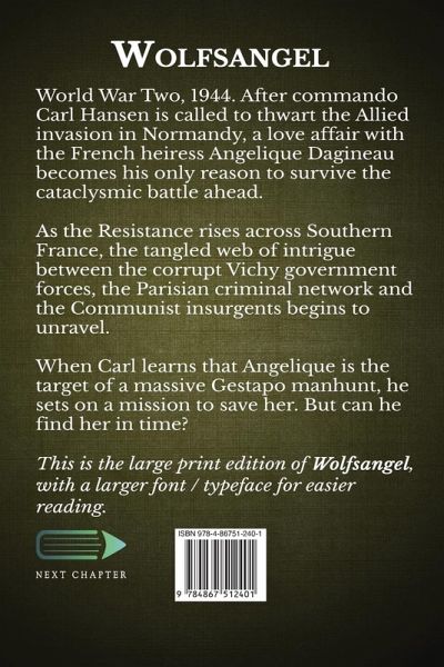 World War Two, 1944. After commando Carl Hansen is called to thwart the Allied invasion in Normandy, a love affair with the French heiress Angelique Dagineau becomes his only reason to survive the cataclysmic battle ahead. As the Resistance rises across Southern France, the tangled web of intrigue between the corrupt Vichy government forces, the Parisian criminal network and the Communist insurgents begins to unravel. When Carl learns that Angelique is the target of a massive Gestapo manhunt, he sets on a mission to save her. But can he find her in time? This is the large print edition of Wolfsangel, with a larger font / typeface for easier reading.