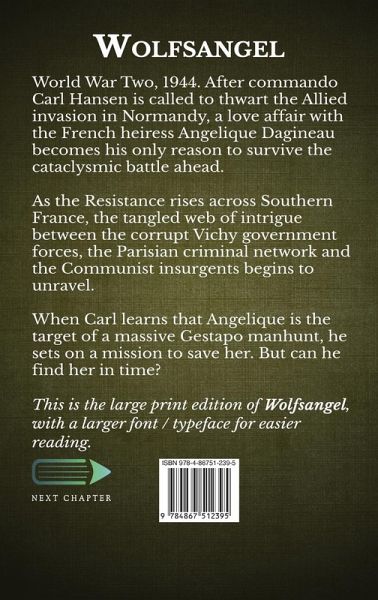 World War Two, 1944. After commando Carl Hansen is called to thwart the Allied invasion in Normandy, a love affair with the French heiress Angelique Dagineau becomes his only reason to survive the cataclysmic battle ahead. As the Resistance rises across Southern France, the tangled web of intrigue between the corrupt Vichy government forces, the Parisian criminal network and the Communist insurgents begins to unravel. When Carl learns that Angelique is the target of a massive Gestapo manhunt, he sets on a mission to save her. But can he find her in time? This is the large print edition of Wolfsangel, with a larger font / typeface for easier reading.