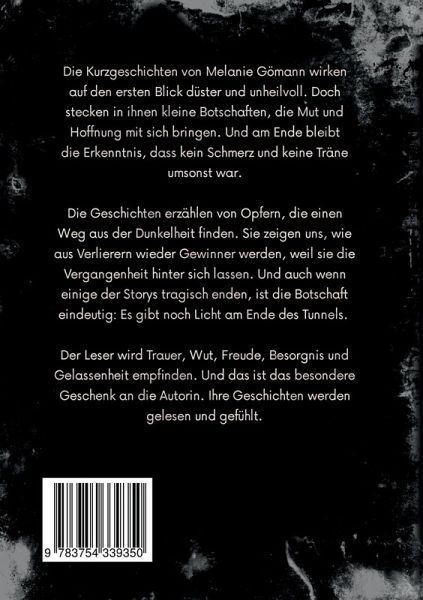 Die Kurzgeschichten von Melanie Gömann wirken auf den ersten Blick düster und unheilvoll. Doch stecken in ihnen kleine Botschaften, die Mut und Hoffnung mit sich bringen. Und am Ende bleibt die Erkenntnis, dass kein Schmerz und keine Träne umsonst war.Die Geschichten erzählen von Opfern, die einen Weg aus der Dunkelheit finden. Sie zeigen uns, wie aus Verlierern wieder Gewinner werden, weil sie die Vergangenheit hinter sich lassen. Und auch wenn einige der Storys tragisch enden, ist die Botschaft eindeutig: Es gibt noch Licht am Ende des Tunnels.Der Leser wird Trauer, Wut, Freude, Besorgnis und Gelassenheit empfinden. Und das ist das besondere Geschenk an die Autorin. Ihre Geschichten werden gelesen und gefühlt.