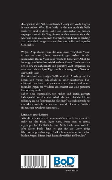 »Der ganz in der Nähe einsetzende Gesang der Wölfe trug sie in eine andere Welt. Eine Welt, in der nur noch sie beide existierten und in deren Liebe und Leidenschaft sie beinahe vergingen - wohin ihr Weg führen mochte, wussten sie nicht. Aber was sie in diesem einen Moment verband, war so übermächtig, dass sie einfach mitgerissen wurden von heißer, verlangender Sehnsucht.« _____________Wegen Drogenhandel wird die vom Luxus verwöhnte Vivian Adams zu zwei Jahren gemeinnütziger Arbeit in den kanadischen Rocky Mountains verurteilt. Unter der Obhut des ihr Angst einflößenden Wolfsforschers Yannic Travis muss sie sich in eine ihr unbekannte und primitive Welt integrieren, die sie schon nach wenigen Tagen an ihrer ausweglosen Situation verzweifeln lässt.Das Verschwinden einiger Wölfe und ein Anschlag auf ihr Leben lässt Vivian schließlich zu einer fanatischen Tierschützerin wachsen, die gemeinsam mit Yannic und seinen Freunden gegen die Wilderer einschreitet und eine grausame Entdeckungmacht ...Neben einer von Höhen und Tiefen geprägte Liebesgeschichte, eine leidenschaftliche und zärtliche Liebeserklärung an ein faszinierendes Geschöpf, das sich niemals hat vom Menschen beherrschen lassen und den Geist der Wildnis bis heute zu bewahren vermochte ...Rezension einer Leserin:"Wolfslicht ist einfach ein wunderschönes Buch, das man nicht mehr aus der Hand legen wird, wenn man es einmal angefangen hat. Es bleibt bis zum Schluss sehr spannend. Ich liebe dieses Buch, denn es gibt für die Leser einige Überraschungen. An einigen Stellen bekommt man doch schon feuchte Augen. Dieses Buch hat mich wirklich tief berührt."