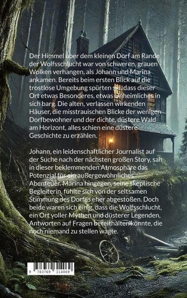 Der Himmel über dem kleinen Dorf am Rande der Wolfsschlucht war von schweren, grauen Wolken verhangen, als Johann und Marina ankamen. Bereits beim ersten Blick auf die trostlose Umgebung spürten sie, dass dieser Ort etwas Besonderes, etwas Unheimliches in sich barg. Die alten, verlassen wirkenden Häuser, die misstrauischen Blicke der wenigen Dorfbewohner und der dichte, düstere Wald am Horizont, alles schien eine düstere Geschichte zu erzählen. Johann, ein leidenschaftlicher Journalist auf der Suche nach der nächsten großen Story, sah in dieser beklemmenden Atmosphäre das Potenzial für ein außergewöhnliches Abenteuer. Marina hingegen, seine skeptische Begleiterin, fühlte sich von der seltsamen Stimmung des Dorfes eher abgestoßen. Doch beide waren sich einig, dass die Wolfsschlucht, ein Ort voller Mythen und düsterer Legenden, Antworten auf Fragen bereithalten könnte, die noch niemand zu stellen wagte.
