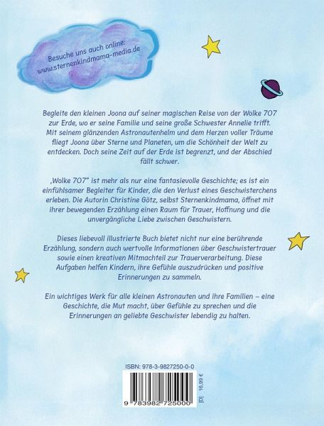 Begleite den kleinen Joona auf seiner magischen Reise von der Wolke 707 zur Erde, wo er seine Familie und seine große Schwester Annelie trifft. Mit seinem glänzenden Astronautenhelm und dem Herzen voller Träume fliegt Joona über Sterne und Planeten, um die Schönheit der Welt zu entdecken. Doch seine Zeit auf der Erde ist begrenzt, und der Abschied fällt schwer. Wolke 707 ist mehr als nur eine fantasievolle Geschichte; es ist ein einfühlsamer Begleiter für Kinder, die den Verlust eines Geschwisterchens erleben. Die Autorin Christine Götz, selbst Sternenkindmama, öffnet mit ihrer bewegenden Erzählung einen Raum für Trauer, Hoffnung und die unvergängliche Liebe zwischen Geschwistern. Dieses liebevoll illustrierte Buch bietet nicht nur eine berührende Erzählung, sondern auch wertvolle Informationen über Geschwistertrauer sowie kreative Mitmachteile zur Trauerverarbeitung. Diese Aufgaben helfen Kindern, ihre Gefühle auszudrücken und positive Erinnerungen zu sammeln. Ein wichtiges Werk für alle kleinen Astronauten und ihre Familien. Eine Geschichte, die Mut macht, über Gefühle zu sprechen und die Erinnerungen an geliebte Geschwister lebendig zu halten.