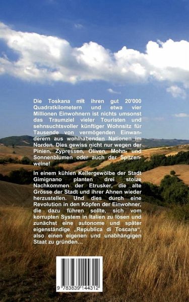 Die Toskana mit ihren gut 20'000 Quadratkilometern und etwa vier Millionen Einwohnern ist nichts umsonst das Traumziel vieler Touristen und sehnsuchtsvoller künftiger Wohnsitz für Tausende von vermögenden Einwan-derern aus wohlhabenden Nationen im Norden. Dies gewiss nicht nur wegen der Pinien, Zypressen, Oliven, Mohn- und Sonnenblumen oder auch der Spitzenweine!In einem kühlen Kellergewölbe der Stadt Gimignano planten drei stolze Nachkommen der Etrusker, die alte Grösse der Stadt und ihrer Ahnen wieder herzustellen. Und dies durch eine Revolution in den Köpfen der Einwohner, die dazu führen sollte, sich vom korrupten System in Italien zu lösen und zunächst eine autonome und später eigenständige "Republica di Toscana", also einen eigenen und unabhängigen Staat zu gründen...