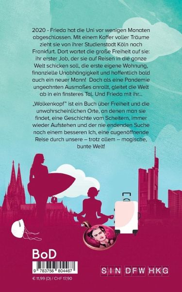 2020 - Frieda hat die Uni vor wenigen Monaten abgeschlossen. Mit einem Koffer voller Träumezieht sie von ihrer Studienstadt Köln nach Frankfurt. Dort wartet die große Freiheit auf sie: ihr erster Job, der sie auf Reisen in die ganze Welt schicken soll, die erste eigene Wohnung, finanzielle Unabhängigkeit und hoffentlich bald auch ein neuer Mann! Doch als eine Pandemie ungeahnten Ausmaßes anrollt, gleitet die Welt ab in ein finsteres Tal. Und Frieda mit ihr..."Wolkenkopf" ist ein Buch über Freiheit und die unwahrscheinlichen Orte, an denen man sie findet, eine Geschichte vom Scheitern, immer wieder Aufstehen und der nie endenden Suche nach einem besseren Ich, eine augenöffnende Reise durch unsere - trotz allem - magische,bunte Welt!