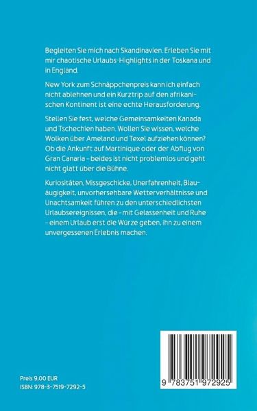 Begleiten Sie mich nach Skandinavien. Erleben Sie mit mir chaotische Urlaubs-Highlights in der Toskana und in England. New York zum Schnäppchenpreis kann ich einfach nicht ablehnen und ein Kurztrip auf den afrikanischen Kontinent ist eine echte Herausforderung.Stellen Sie fest, welche Gemeinsamkeiten Kanada und Tschechien haben. Wollen Sie wissen, welche Wolken über Ameland und Texel aufziehen können? Ob die Ankunft auf Martinique oder der Abflug von Gran Canaria, beides ist nicht problemlos und geht nicht glatt über die Bühne.Kuriositäten, Missgeschicke, Unerfahrenheit, Blauäugigkeit, unvorhersehbare Wetterverhältnisse und Unachtsamkeit führen zu den unterschiedlichsten Urlaubsereignissen, die mit Gelassenheit und Ruhe einem Urlaub erst die Würze geben und ihn zu einem unvergessenen Erlebnis machen.