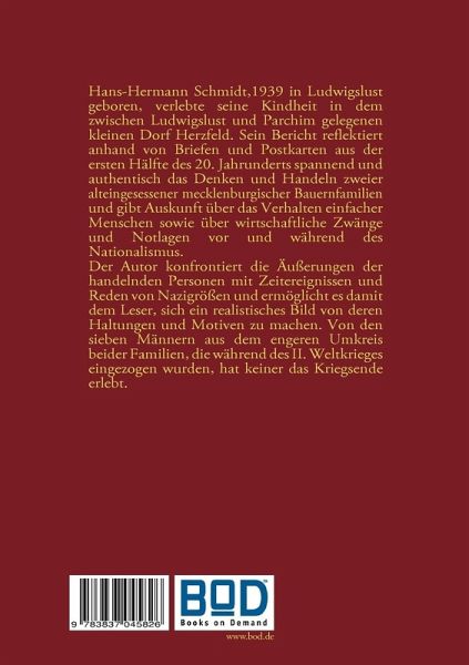 Hans-Hermann Schmidt,1939 in Ludwigslust geboren, verlebte seine Kindheit in dem zwischen Ludwigslust und Parchim gelegenen kleinen Dorf Herzfeld. Sein Bericht reflektiert anhand von Briefen und Postkarten aus der ersten Hälfte des 20. Jahrunderts spannend und authentisch das Denken und Handeln zweier alteingesessener mecklenburgischer Bauernfamilien und gibt Auskunft über das Verhalten einfacher Menschen sowie über wirtschaftliche Zwänge und Notlagen vor und während des Nationalismus.Der Autor konfrontiert die Äußerungen der handelnden Personen mit Zeitereignissen und Reden von Nazigrößen und ermöglicht es damit dem Leser, sich ein realistisches Bild von deren Haltungen und Motiven zu machen. Von den sieben Männern aus dem engeren Umkreis beider Familien, die während des II. Weltkrieges eingezogen wurden, hat keiner das Kriegsende erlebt.