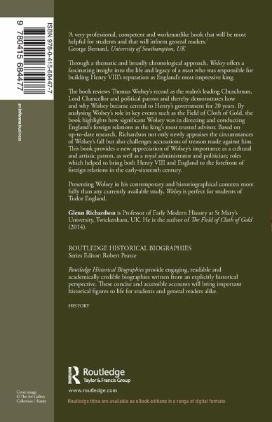 The book reviews Thomas Wolsey's record as the realm's leading Churchman, Lord Chancellor and political patron and thereby demonstrates how and why Wolsey became central to Henry's government for 20 years. By analysing Wolsey's role in key events such as the Field of Cloth of Gold, the study highlights how significant Wolsey was in directing and conducting England's foreign relations as the king's most trusted advisor. Based on up-to-date research, Richardson not only newly appraises the circumstances of Wolsey's fall but also challenges accusations of treason made against him. This study provides a new appreciation of Wolsey's importance as a cultural and artistic patron, as well as a royal administrator and politician; roles which helped to bring both Henry VIII and England to the forefront of foreign relations in the early-sixteenth century.