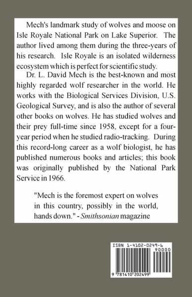 Mech's landmark study of wolves and moose on Isle Royale National Park on Lake Superior. The author lived among them during the three-years of his research. Isle Royale is an isolated wilderness ecosystem which is perfect for scientific study. Dr. L. David Mech is the best-known and most highly regarded wolf researcher in the world. He works with the Biological Services Division, U.S. Geological Survey, and is also the author of several other books on wolves. He has studied wolves and their prey full-time since 1958, except for a four-year period when he studied radio-tracking. During this record-long career as a wolf biologist, he has published numerous books and articles; this book was originally published by the National Park Service in 1966. "Mech is the foremost expert on wolves in this country, possibly in the world, hands down." - Smithsonian magazine