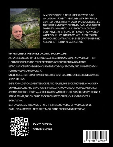 Step into the majestic realm teeming with mystery and allure in "Wolves & Forest Dwellers: A Majestic Large Print A4 Coloring Book Adventure"! This extraordinary coloring book invites older kids, teens, and adults to explore and revel in the captivating charm of magnificent wolves and diverse forest creatures. Key Features: 39 meticulously crafted, large print A4 illustrations, showcasing wolves in their vast forest territories and other creatures in their diverse habitats. Suitable for older kids, teens, and adults alike, providing endless hours of relaxation and creative expression. Printed on single-sided pages to prevent bleed-through and allow easy removal for display. High-quality paper, perfectly suited for coloring with colored pencils, markers, or crayons. From majestic wolves howling beneath the moon to diverse creatures uncovering wonders in dense undergrowth, "Wolves & Forest Dwellers: A Majestic Large Print A4 Coloring Book Adventure" presents a wide range of captivating scenarios that highlight the beauty and mystery of these enthralling creatures. This coloring book serves as a perfect gift for birthdays, holidays, or as a special surprise for any budding artist or wildlife enthusiast. Ignite their creativity, fuel their imagination, and let them dive into the thrilling realm of wolves and forest creatures. Grab your copy of "Wolves & Forest Dwellers: A Majestic Large Print A4 Coloring Book Adventure" today, and let the majestic world of wolves and forest dwellers come alive on every page!