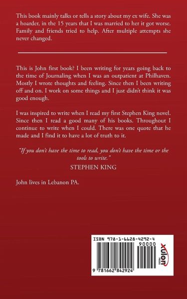 This book mainly talks or tells a story about my ex wife. She was a hoarder, in the 15 years that I was married to her it got worse. Family and friends tried to help. After multiple attempts she never changed. This is John first book? I been writing for years going back to the time of Journaling when I was an outpatient at Philhaven. Mostly I wrote thoughts and feeling. Since then I been writing off and on. I work on some things and I just didn't think it was good enough. I was inspired to write when I read my first Stephen King novel. Since then I read a good many of his books. Throughout I continue to write when I could. There was one quote that he made and I find it to have a lot of truth to it. "If you don't have the time to read, you don't have the time or the tools to write." Stephen King John lives in Lebanon PA.