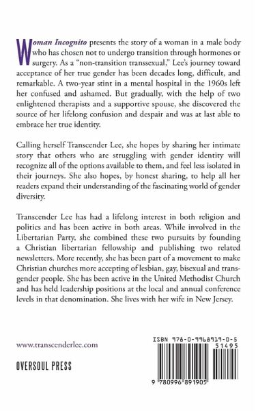 Woman Incognito is the story of a woman in a male body who has chosen not to undergo transition through hormones or surgery. Lee's journey toward acceptance of her true gender has been long and difficult. After decades of struggle, she discovered the source of her lifelong confusion and despair and was finally able to embrace her true identity.