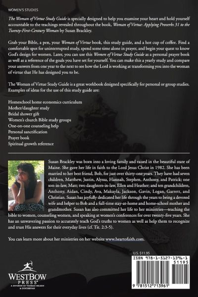 The Woman of Virtue Study Guide is specially designed to help you examine your heart and hold yourself accountable to the teachings revealed throughout the book, Woman of Virtue: Applying Proverbs 31 to the Twenty-First-Century Woman by Susan Brackley. Grab your Bible, a pen, your Woman of Virtue book, this study guide, and a hot cup of coffee. Find a comfortable spot for uninterrupted study, spend some time alone in prayer, and begin your quest to know God's design for women. Later, you can use this Women of Virtue Study Guide as a personal prayer book as well as a reference of the goals you have set for yourself. You can make this a yearly study and compare your answers from one year to the next to see how the Lord is working at transforming you into the woman of virtue that He has designed you to be. The Woman of Virtue Study Guide is a great workbook designed specifically for personal or group studies. Examples of ideas for the use of this study guide are: Homeschool home economics curriculum Mother/daughter study Bridal shower gift Women's church Bible study groups One-on-one counseling help Personal sanctification Prayer book Spiritual growth reference