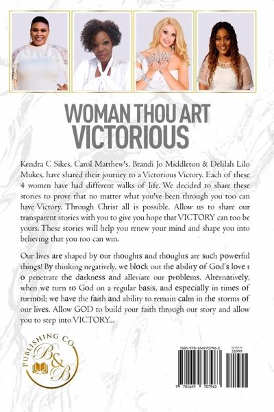 Kendra C Sikes, Carol Matthew's, Brandi Jo Middleton & Delilah Lilo Mukes, have shared their journey to a Victorious Victory. Each of these 4 women have had different walks of life. We decided to share these stories to prove that no matter what you've been through you too can have Victory. Through Christ all is possible. Allow us to share our transparent stories with you to give you hope that VICTORY can too be yours. These stories will help you renew your mind and shape you into believing that you too can win.