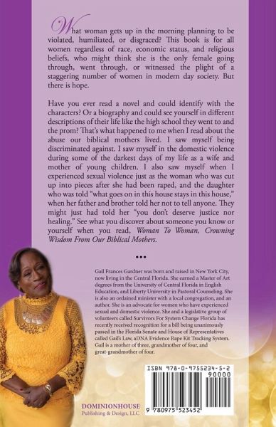 What woman gets up in the morning planning to be violated, humiliated, or disgraced? This book is for all women regardless of race, economic status, and religious beliefs, who might think she is the only female going through, went through, or witnessed the plight of a staggering number of women in modern day society. But there is hope. Have you ever read a novel and could identify with the characters? Or a biography and could see yourself in different descriptions of their life like the high school they went to and the prom? That's what happened to me when I read about the abuse our biblical mothers lived. I saw myself being discriminated against. I saw myself in the domestic violence during some of the darkest days of my life as a wife and mother of young children. I also saw myself when I experienced sexual violence just as the woman who was cut up into pieces after she had been raped, and the daughter who was told "what goes on in this house stays in this house," when her father and brother told her not to tell anyone. They might just had told her "you don't deserve justice nor healing." See what you discover about someone you know or yourself when you read, Woman To Woman, Crowning Wisdom From Our Biblical Mothers.