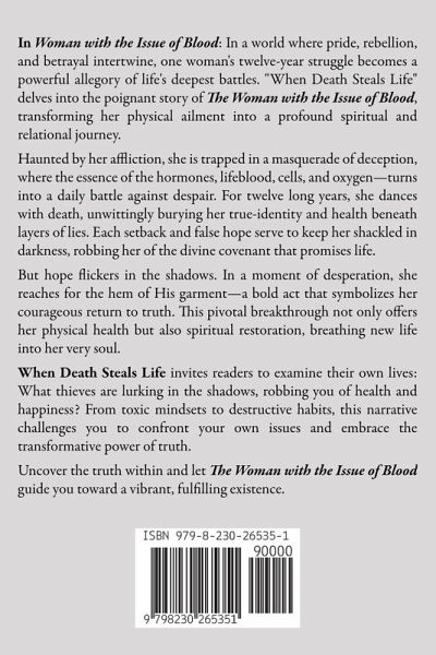 In Woman with the Issue of Blood: In a world where pride, rebellion, and betrayal intertwine, one woman's twelve-year struggle becomes a powerful allegory of life's deepest battles. "When Death Steals Life" delves into the poignant story of The Woman with the Issue of Blood, transforming her physical ailment into a profound spiritual and relational journey. Haunted by her affliction, she is trapped in a masquerade of deception, where the essence of the hormones, lifeblood, cells, and oxygen-turns into a daily battle against despair. For twelve long years, she dances with death, unwittingly burying her true-identity and health beneath layers of lies. Each setback and false hope serve to keep her shackled in darkness, robbing her of the divine covenant that promises life. But hope flickers in the shadows. In a moment of desperation, she reaches for the hem of His garment-a bold act that symbolizes her courageous return to truth. This pivotal breakthrough not only offers her physical health but also spiritual restoration, breathing new life into her very soul. When Death Steals Life invites readers to examine their own lives: What thieves are lurking in the shadows, robbing you of health and happiness? From toxic mindsets to destructive habits, this narrative challenges you to confront your own issues and embrace the transformative power of truth. Uncover the truth within and let The Woman with the Issue of Blood guide you toward a vibrant, fulfilling existence.