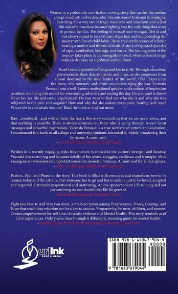 Woman is a profoundly non-fiction moving story that carries the readers along from drastic to the dreamful. The outcome of trials and tribulations. Searching for a way out of tragic moments and situations and is just this side of miraculous because fighting was the only thing that arose to protect her life. The feeling of miscast and wronged. She is and was always meant to be a Woman. Rejection and compounding her misery with forced child labor. There are horrific scenes of a father beating a mother and threats of death. A story of repeated episodes of rape, humiliation, beatings, and burns. The turning point of the journey takes place in an immigration court, where a federal judge makes a decision on a political asylum claim. Read how she spreads her wings and learns to fly. Through education, perseverance, sheer determination, and hope, as she progresses from almost doormat to the food basket of the world, USA. Experience the many new romantic and erotic encounters along the way. Veemala Persaud now a well-known motivational speaker and a source of inspiration to others, is a living role model for overcoming adversity and seizing the day. Do you want to know about her sex life and erotic experiences? Do you want to find out who she is and why she was subjected to the pain and anguish? How and why did she endure every pain, beating, and rape? Where she is and what's become? Read the book to find out more. Raw...emotional...and written from the heart, this story reminds us that we are never alone, and that anything is possible. There is always someone out there who is going through worse! Great messages and powerful inspirations. Veemala Persaud is a true survivor of torture and alienation. I recommend this book to all college and university students interested in widely broadening their horizons. A must read! - Dr. David Brizer, Writer and Life Coach Written in a warmly engaging style, this memoir is rooted in the author's strength and honesty. Veemala shares moving and intimate details of her abuse, struggles, resilience and triumphs while raising social awareness on important issues like domestic violence. A must read for all disciplines. - Adrea S. Ogle, Esq. Family Law Practitioner Passion, Pain, and Please in the story. This book is filled with resources and reminds us how to be human today and the extreme that someone has to go and has to endure just to be loved, accepted and respected. Extremely inspirational and motivating. An eye opener to view Life as living and not just surviving no one should take life for granted. -Kenneth Rampersaud, Psychiatric Nurse Fight you have to and Win you must, is my description among Perseverance, Power, Courage, and Hope that teach how rejection can be a key to success. Empowering for men, children, and women. Creates empowerment for self-love, domestic violence and Mental Health. This story reminds us of Life's experiences. Only you've been through it differently. Amazing guide for mental health. -Suresh Sugrim, President of Humanitarian Mission Guyana Inc.