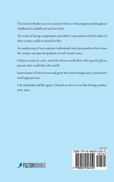 This book will take you on a journey where a twin progresses throughout childhood to adulthood and love lost. The trails of facing comparison and others' expectations of their ideas of what a twin could or should be like. An awakening of two separate individuals with personalities that show the unique and special qualities of each womb mate. Choices made by each, and how these would show this special gift to parents that could bless the world. Instructions of how to treat and grow this mirror image into a productive and happy person. Life and death and life again. A friend so close, it was like having another twin sister.