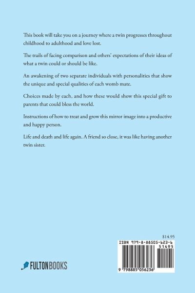 This book will take you on a journey where a twin progresses throughout childhood to adulthood and love lost. The trails of facing comparison and others' expectations of their ideas of what a twin could or should be like. An awakening of two separate individuals with personalities that show the unique and special qualities of each womb mate. Choices made by each, and how these would show this special gift to parents that could bless the world. Instructions of how to treat and grow this mirror image into a productive and happy person. Life and death and life again. A friend so close, it was like having another twin sister.