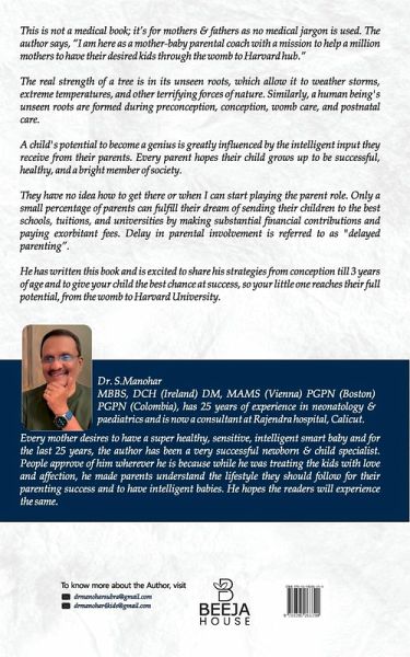 This is not a medical book; it's for mothers & fathers as no medical jargon is used. The author says, "I am here as a mother-baby parental coach with a mission to help a million mothers to have their desired kids through the womb to Harvard hub." The real strength of a tree is in its unseen roots, which allow it to weather storms, extreme temperatures, and other terrifying forces of nature. Similarly, a human being's unseen roots are formed during preconception, conception, womb care, and postnatal care. A child's potential to become a genius is greatly influenced by the intelligent input they receive from their parents. Every parent hopes their child grows up to be successful, healthy, and a bright member of society. They have no idea how to get there or when I can start playing the parent role. Only a small percentage of parents can fulfill their dream of sending their children to the best schools, tuitions, and universities by making substantial financial contributions and paying exorbitant fees. Delay in parental involvement is referred to as ""delayed parenting". He has written this book and is excited to share his strategies from conception till 3 years of age and to give your child the best chance at success, so your little one reaches their full potential, from the womb to Harvard University. _________________________________________________________________________ ABOUT THE AUTHOR Dr. S.Manohar MBBS, DCH (Ireland) DM, MAMS (Vienna) PGPN (Boston) PGPN (Colombia), has 25 years of experience in neonatology & paediatrics and is now a consultant at Rajendra hospital, Calicut. Every mother desires to have a super healthy, sensitive, intelligent smart baby and for the last 25 years, the author has been a very successful newborn & child specialist. People approve of him wherever he is because while he was treating the kids with love and affection, he made parents understand the lifestyle they should follow for their parenting success and to have intelligent babies. He hopes the readers will experience the same.