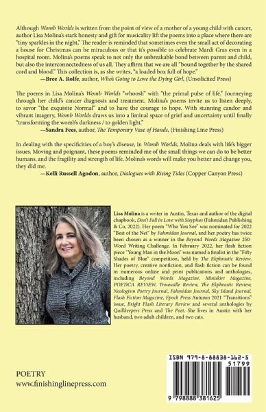 In "Womb Worlds," Lisa Molina invites the reader into her most intimate world where the darkness of disease collides with the tenderness of a mother's love, as she grapples with the most terrifying corners of motherhood. The speaker in these poems is a mother with a young son going through cancer treatment at ages three, eleven, and thirteen; ultimately requiring an umbilical cord blood transplant from an unknown donor as a final effort to save his life. From her son's initial diagnosis at age three, to his transplant ten years later, she writes both of specific events that occurred in exacting detail, as well as her own interior world of terror, gratitude, and growth as a woman throughout the experience. Never dwelling on what is lost, the poems in this collection focus on the light and learning that can be gained through suffering. These poems, written mostly in a prose/free verse style will make you feel every emotion, as you journey with Molina, her son, and her family throughout years of the roller coaster ride of pediatric cancer treatments. The book includes life-affirming full color abstract drawings and a beautiful watercolor to enhance Molina's words.
