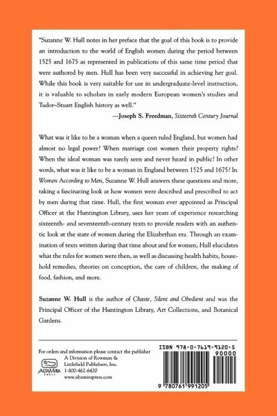 What was it like to be a woman when England was ruled by a queen, but women had almost no legal power? When marriage cost women their property rights? When the ideal woman was rarely seen and never heard in public? In other words, what was it like to be a woman in England between 1525 and 1675? Suzanne Hull, in Women According to Men answers these questions and more, taking fascinating look at how women were described, and prescribed to act, by men during that time.