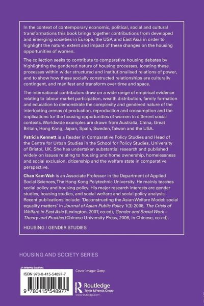 1. Introduction: Gender and Housing in an International Context 2. Women's Housing Rights: What is the Matter with the International Norm? 3. Women and Housing: The Australian Experience 4. Women and Housing Affordability in the United States 5. Social Change and Housing Systems: The Case of Women in Spain 6. Women's Housing in Sweden 7.Women, Housing and Citizenship in Great Britain 8. Moving Beyond the Standard Family Model: The Emerging Housing Situation of Women in Japan 9. Neoliberalization and the Invisibility of Women's Housing Problems in Taiwan 10. A Gender Study of the Housing Rights of Women in Urban China - a Case Study of a Single Parent Female Domestic Workers' Group 11. Women and Housing in Hong Kong 12. Conclusion