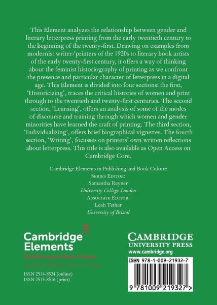 This Element analyses the relationship between gender and literary letterpress printing from the early 20th century to the beginning of the 21st. This title is also available as Open Access on Cambridge Core.
