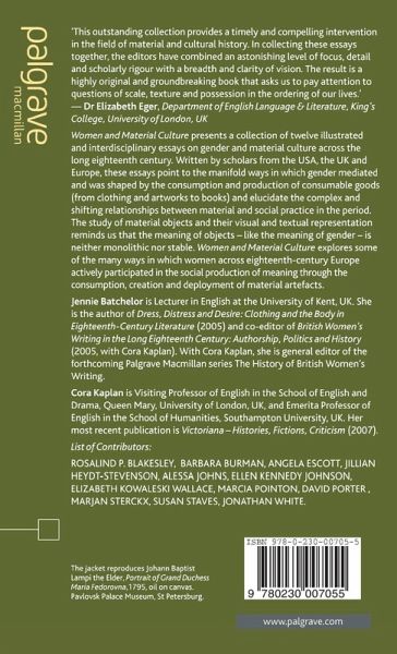 List of Illustrations Acknowledgements Notes on Contributors Introduction; J .Batchelor & C.Kaplan SECTION I: DRESS AND ADORNMENT Women and their Jewels; M.Pointon Fanny's Pockets: Cotton, Consumption and Domestic Economy, 1780-1850; B.Burman & J.White 'Changing her gown and setting her head to rights': New Shops, New Hats, and New Identities; J.Heydt-Stevenson SECTION II: WOMEN AND SCULPTURE Sculpting in Tiaras: Grand Duchess Maria Federovna as a Producer and Consumer of the Arts; R.P.Blakesley Pride and Prejudice: Eighteenth-Century Women Sculptors and their Material Practices; M.Sterckx A Female Sculptor and Connoisseur: Artistic Self-Fashioning and the Exposure of Connoisseurship, Collecting and Concupiscence; A.Escott SECTION III: THE MATERIAL CULTURE OF EMPIRE 'The Taste for Bringing the Outside In': Nationalism, Gender and Landscape Wallpaper (1700-1825); E.K.Johnson Taihu Tatlers: Aesthetic Translation in the China Trade; D.L.Porter White Slavery: Hannah More, Women and Fashion; E.K.Wallace SECTION IV: WOMEN AND BOOKS Reinstating 'The Pamela Vogue'; J.Batchelor The Book as Cosmopolitan Object: Women's Publishing, Collecting, and Anglo-German Exchange; A.Johns 'Books Without Which I Cannot Write': How did Eighteenth-Century Women Writers Get the Books they Read?; S.Staves Select Bibliography Index