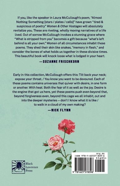 If you, like the speaker in Laura McCullough's poem, "Almost Nothing Something [stars / plates / cells]" have grown "tired & suspicious of poetry" Women & Other Hostages will absolutely revitalize you. These are riveting, wholly moving narratives of a life lived. Out of sorrow McCullough invokes a stunning grace where "What is stripped from you" becomes a gift because "what's left behind is all your own." Women of all circumstances inhabit these poems. They shed their skin like snakes, "memory in flesh," and consider the bones of what holds us together in these divisive times. This beautiful book will knock loose what is lodged in your heart. -Suzanne Frischkorn Early in this collection, McCullough offers this: Tilt back your neck; expose your throat. / You know you want to be devoured. Each of these poems contains universes that quiver with desire, in one form or another. With heat. Both the fear of it as well as the joy. Desire is the engine that got us here, yet these poems push even beyond that, beyond forgiveness even, beyond this cage we all inhabit, out and into the deeper mysteries-don't I know what it is like / to walk in a cloud of my own making? - Nick Flynn