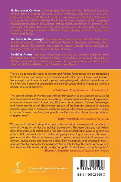 Women&BAD:rsquo;s participation in the United States is shaped by the changing landscape of the country&BAD:rsquo;s cultural history. Through an exploration of the political socialization of women, the authors give students a powerful way to understand the gender gap in political attitudes, patterns of women&BAD:rsquo;s political participation, and women as members of the political elite.For this new second edition the authors have updated every chapter with new content and data. Greater coverage of the interaction of gender, race, class, ethnicity, and age is integrated throughout and alongside additional material on feminism, Title IX, origins of the gender gap, and more on agents of socialization.
