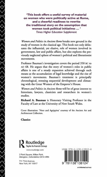 Bauman delineates not only the influential and manipulative role of Roman women in the business of government, law and public affairs in general, but also the emergence of women's political and liberationist movements.
