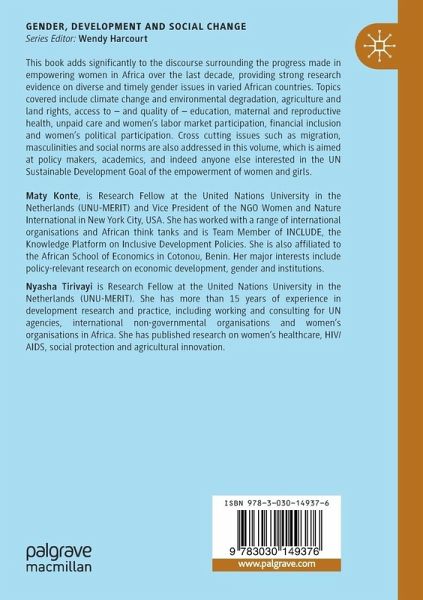 This book adds significantly to the discourse surrounding the progress made in empowering women in Africa over the last decade, providing strong research evidence on diverse and timely gender issues in varied African countries. Topics covered include climate change and environmental degradation, agriculture and land rights, access to - and quality of - education, maternal and reproductive health, unpaid care and women's labor market participation, financial inclusion and women's political participation. Cross cutting issues such as migration, masculinities and social norms are also addressed in this volume, which is aimed at policy makers, academics, and indeed anyone else interested in the UN Sustainable Development Goal of the empowerment of women and girls.