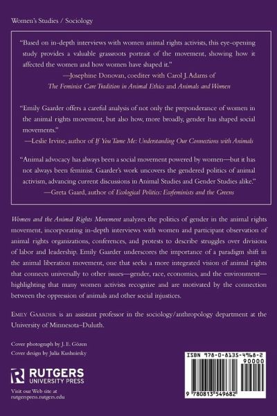 Animal rights is one of the fastest growing social movements today. Women greatly outnumber men as activists, yet surprisingly, little has been written about the importance and impact of gender on the movement. Women and the Animal Rights Movement combats stereotypes of women activists as mere sentimentalists by exploring the political and moral character of their advocacy on behalf of animals. Emily Gaarder analyzes the politics of gender in the movement, incorporating in-depth interviews with women and participant observation of animal rights organizations, conferences, and protests to describe struggles over divisions of labor and leadership. Controversies over PETA advertising campaigns that rely on women's sexuality to "sell" animal rights illustrate how female crusaders are asked to prioritize the cause of animals above all else. Gaarder underscores the importance of a paradigm shift in the animal liberation movement, one that seeks a more integrated vision of animal rights that connects universally to other issues--gender, race, economics, and the environment--highlighting that many women activists recognize and are motivated by the connection between the oppression of animals and other social injustices.