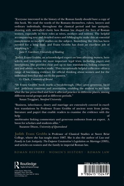 It is widely recognized that Roman law is an important source of information about women in the Roman world, and can present a more rounded and accurate picture than literary sources. This sourcebook fully exploits the rich legal material of the imperial period - from Augustus (31 BCE - 14 CE) to the end of the western Roman Empire (476 CE), incorporating both pagan and Christian eras, and explaining the rights women held under Roman law, the restrictions to which they were subject, and legal regulations on marriage, divorce and widowhood.