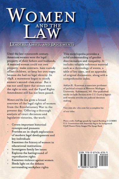 A definitive overview of court decisions and legislative victories in the fight for gender equality in U.S. history. Women and the Law: Leaders, Cases, and Documents chronicles the evolution of women's rights from the Revolutionary War to the present day. Spanning the gamut of legal concepts, court decisions, justices, and organizations, this extensive reference also explores a broad range of issues from sexual harassment and spousal abuse to the gender gap in voting and the custody challenge of Baby M. Profiles of Susan B. Anthony, Ruth Bader Ginsburg, Anita Hill, Betty Friedan, and other activists explore their roles in bringing the issue of equal rights for women to the forefront of U.S. politics. A thorough review of key legislative acts, including the 19th Amendment, the Equal Pay Act, the Pregnancy Discrimination Act, Title IX of the Educational Amendments, and more recent rulings like the Violence against Women Act of 1994 reveals the successes, failures, and tenacious efforts of those who are fighting to achieve gender equality in the United States.