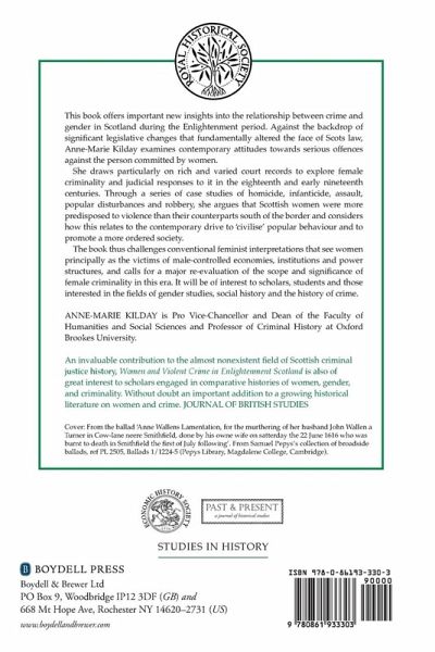 This book offers important new insights into the relationship between crime and gender in Scotland during the Enlightenment period. Against the backdrop of significant legislative changes that fundamentally altered the face of Scots law, Anne-Marie Kilday examines contemporary attitudes towards serious offences against the person committed by women. She draws particularly on rich and varied court records to explores female criminality and judicial responses to it in the eighteenth and early nineteenth centuries.Through a series of case studies of homicide, infanticide, assault, popular disturbances and robbery, she argues that Scottish women were more predisposed to violence than their counterparts south of the border and considers how this relates to the contemporary drive to civilise' popular behaviour and to promote a more ordered society. The book thus challenges conventional feminist interpretations that see women principally as the victims of male-controlled economies, institutions and power structures, and calls for a major re-evaluation of the scope and significance of female criminality in this era. It will be of interest to scholars, students and those interested in the fields of gender studies, social history and the history of crime. ANNE-MARIE KILDAY is Pro Vice-Chancellor and Dean of the Faculty of Humanities and Social Sciences and Professor of Criminal History at Oxford Brookes University.