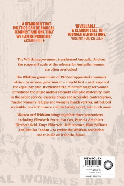 The Whitlam government transformed Australia. And yet the scope and scale of the reforms for Australian women are often overlooked. The Whitlam government of 1972-75 appointed a women's advisor to national government - a world first - and reopened the equal pay case. It extended the minimum wage for women, introduced the single mother's benefit and paid maternity leave in the public service, ensured cheap and accessible contraception, funded women's refuges and women's health centres, introduced accessible, no-fault divorce and the Family Court, and much more. Women and Whitlam brings together three generations - including Elizabeth Evatt, Eva Cox, Patricia Amphlett, Elizabeth Reid, Tanya Plibersek, Heidi Norman, Blair Williams and Ranuka Tandan - to revisit the Whitlam revolution and to build on it for the future. 'Political history at its best.' - Jenny Hocking '... a reminder that politics can be radical, feminist and one that we can be proud of.' - Yasmin Poole 'Invaluable ... a clarion call to younger generations.' - Virginia Haussegger